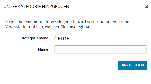 Hier findest du nun bereits alle Kategorien und Unterkategorien, welche im Standard in deinem Eventmanager vorhanden sind. Um deine eigene Kategorie hinzuzufügen, klicke auf den Button Hinzufügen.