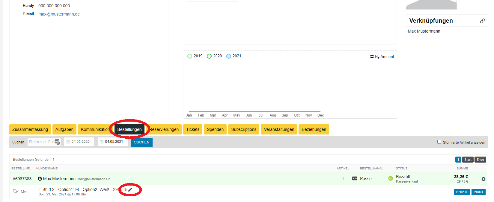 Um das Event oder den Veranstaltungstag zu ändern, gehen wir auf den Reiter "CRM -> Kundendetails". Wir suchen nun den Kunden in der Suchleiste, welcher die Bestellung getätigt hat. Wir gehen auf den Reiter "Bestellungen" und öffnen somit die Liste der Bestellungen des Kunden. Um die bestellten Produkte einsehen zu können, muss auf den Namen des Bestellers geklickt werden. Danach muss das zu verknüpfende Produkt gesucht werden. Rechts neben dem Preis befindet sich ein kleiner, schwarzer Stift, welchen wir nun auswählen. (siehe unten)