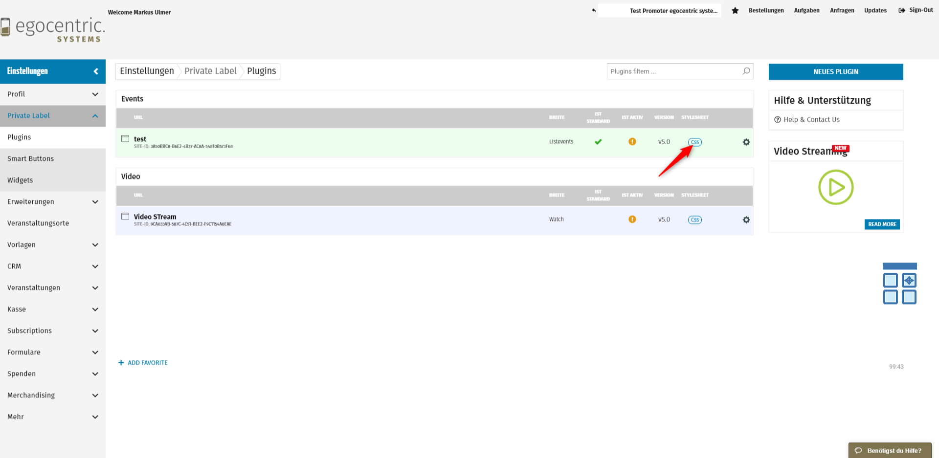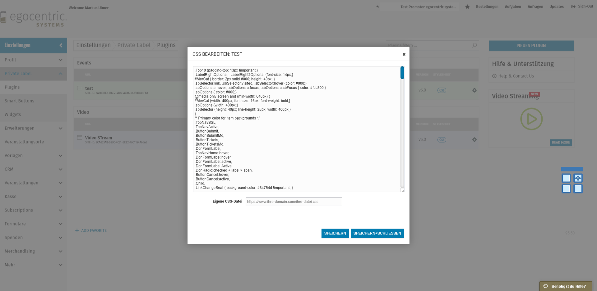 Um das Standard-CSS des Plugins zu bearbeiten, gehen Sie zu Einstellungen > Private Label > Plugins und klicken Sie auf das Feld CSS des Plugins, das Sie ändern möchten.