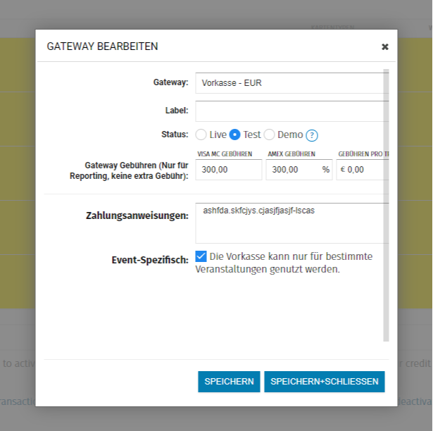 Zuerst musst du die Zahlart an sich einrichten (Siehe dazu Zahlart Vorkasse). In dieser Zahlart nimmst du nun die Einschränkung vor, dass diese nur für bestimmte Events verwendet werden soll. Setzte dazu den Hacken bei Event-Spezifisch.