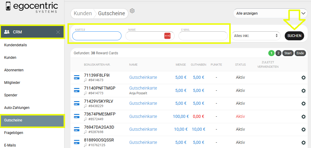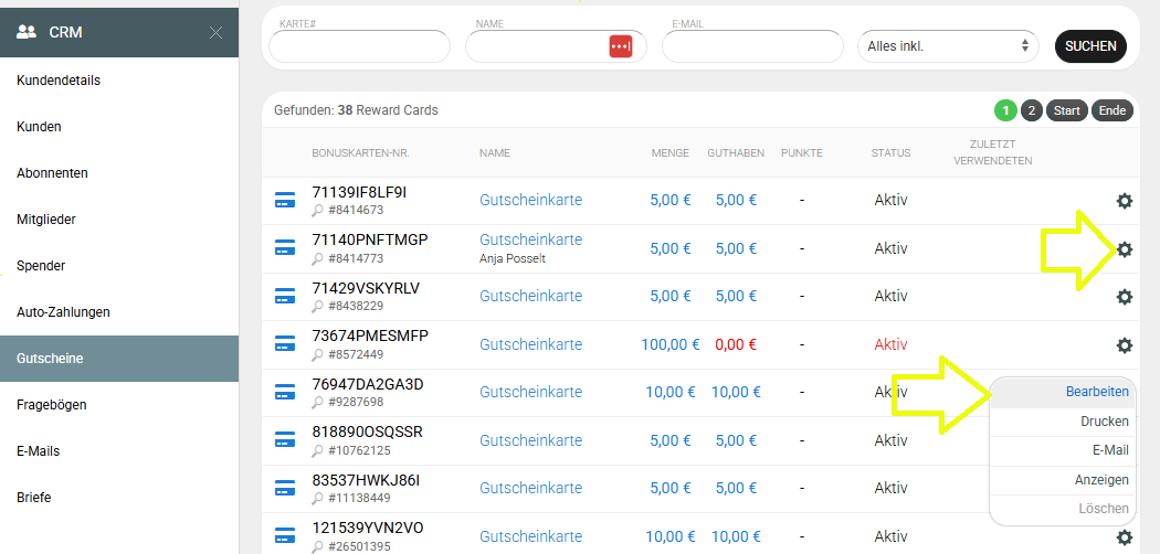 2. Wähle „CRM“ → „Gutscheine“.