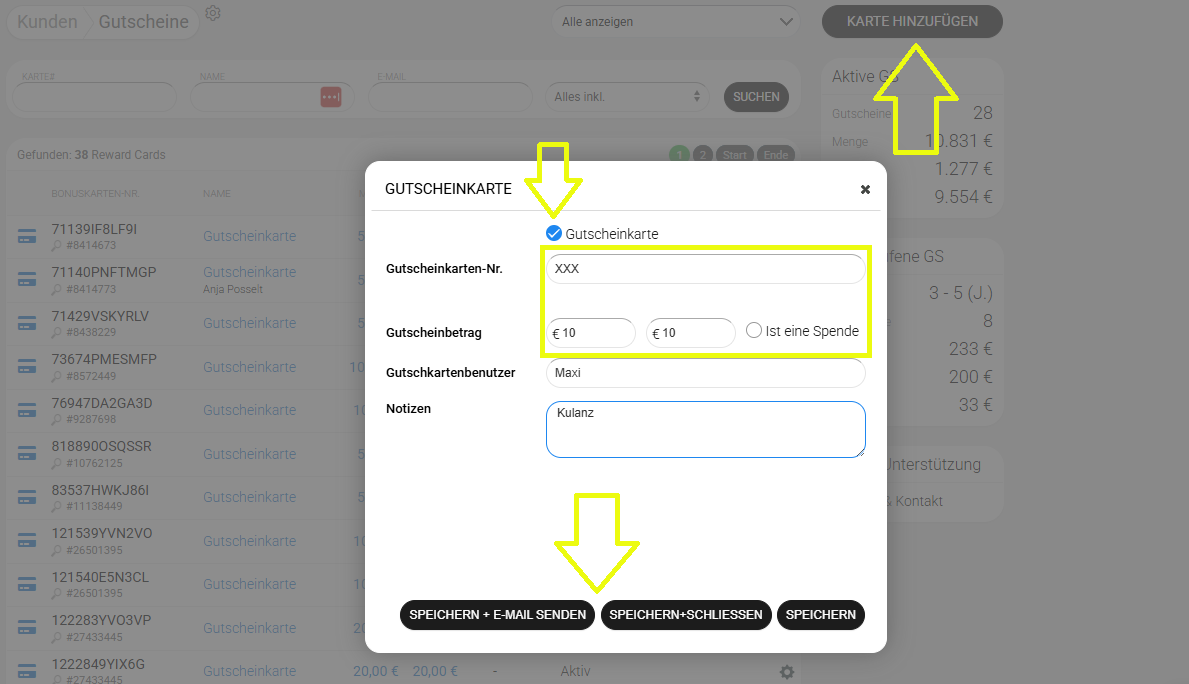 - Die Gutscheinverwaltung ermöglicht es, Gutscheine einfach einzusehen, zu bearbeiten und zu generieren.