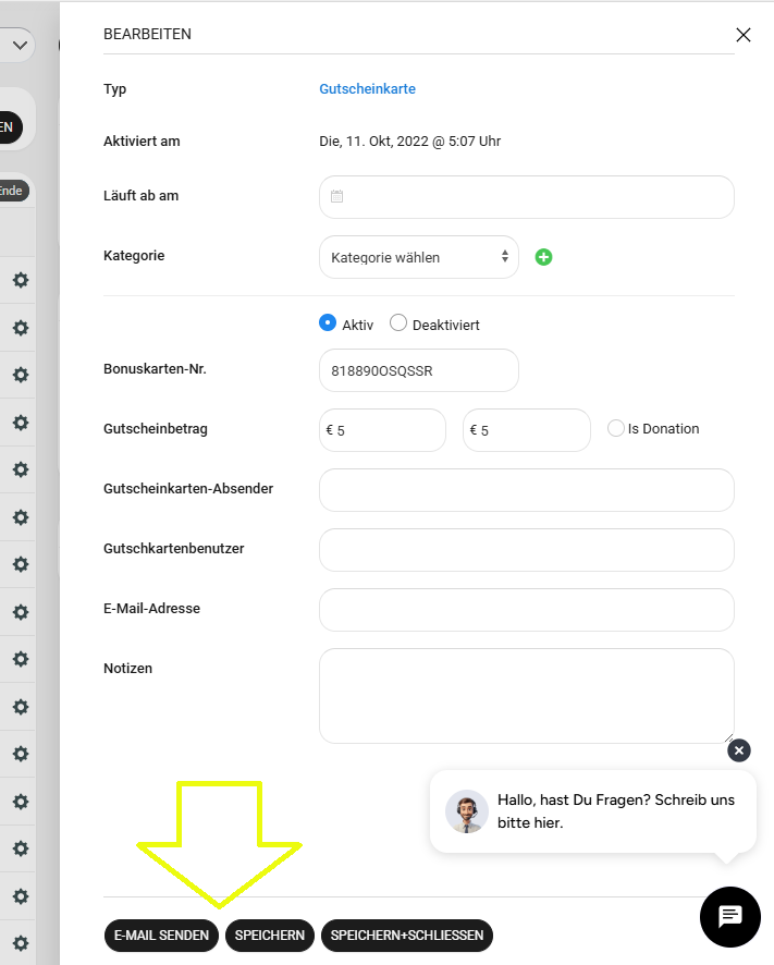 7. Klicke auf "Speichern" oder auf "Speichern + E-Mail senden" (um dem Kunden über die Gutscheinerstellung zu informieren).