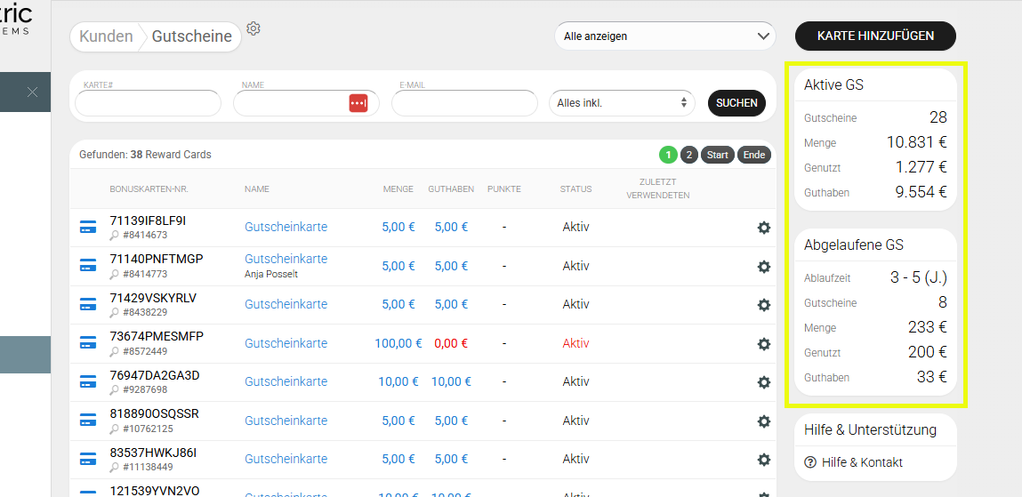 In der rechten Spalte der Übersicht findest Du einen kurzen Report, der Dir zeigt, wie viele aktive Gutscheine im Umlauf sind, welches Gesamtvermögen diese umfasst haben und was davon noch an verfügbaren Guthaben offen ist. Das gleiche ist auch für die in den letzten Jahren abgelaufenen Gutscheinen aufgelistet. Hier erfährst Du auch, welches Guthaben nicht eingelöst wurde.