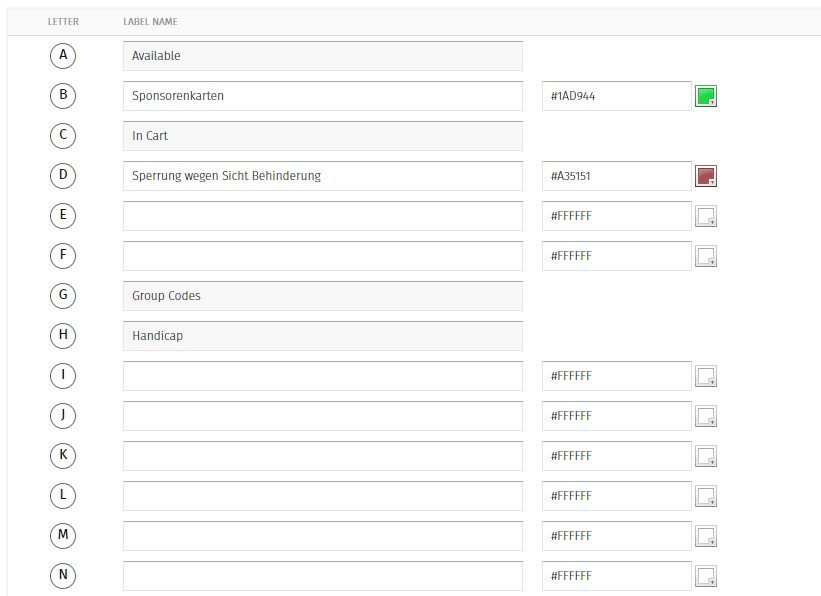 Die Administration von Bezeichnungen und Farben für die gesperrten oder blockierten Sitzplätze kannst du zentral unter Veranstaltungen --> Sitzetiketten anlegen und bearbeiten.