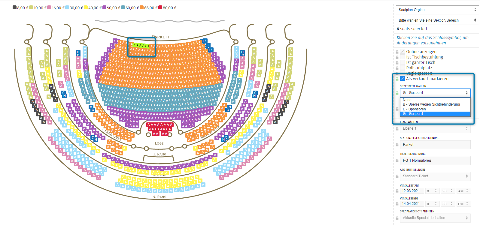 Wenn du die Plätze markiert hast, kannst du nun im Konfigurationsmenü auf der rechten Seite den Hacken bei Als verkauft markieren setzten um die Plätze dem Kontingent hinzuzufügen oder entfernen um die Plätze aus dem Kontingent zu entfernen.