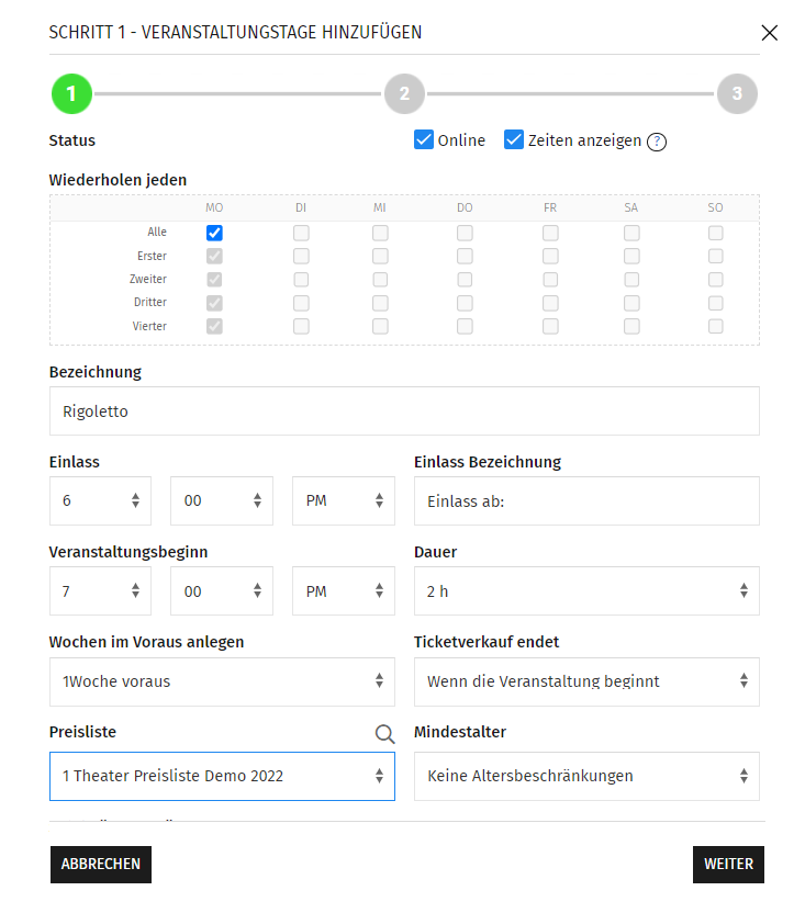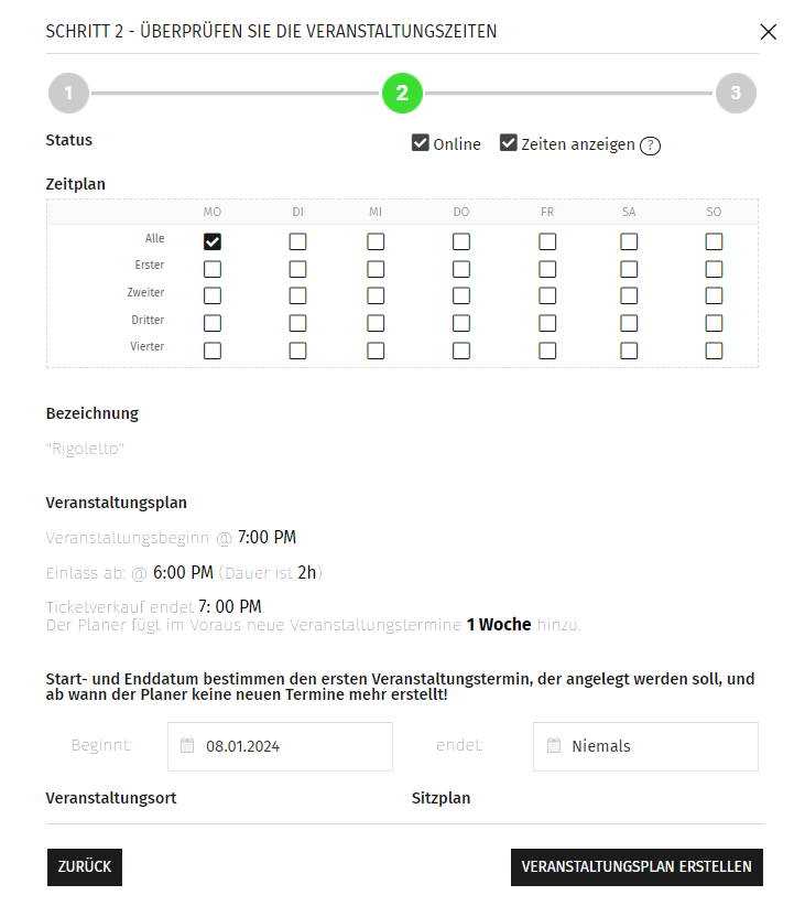 - Stelle Wochentage, Event-Wiederholungen, Einlass, Beginn, Ticketverkaufsende und Preisliste ein.