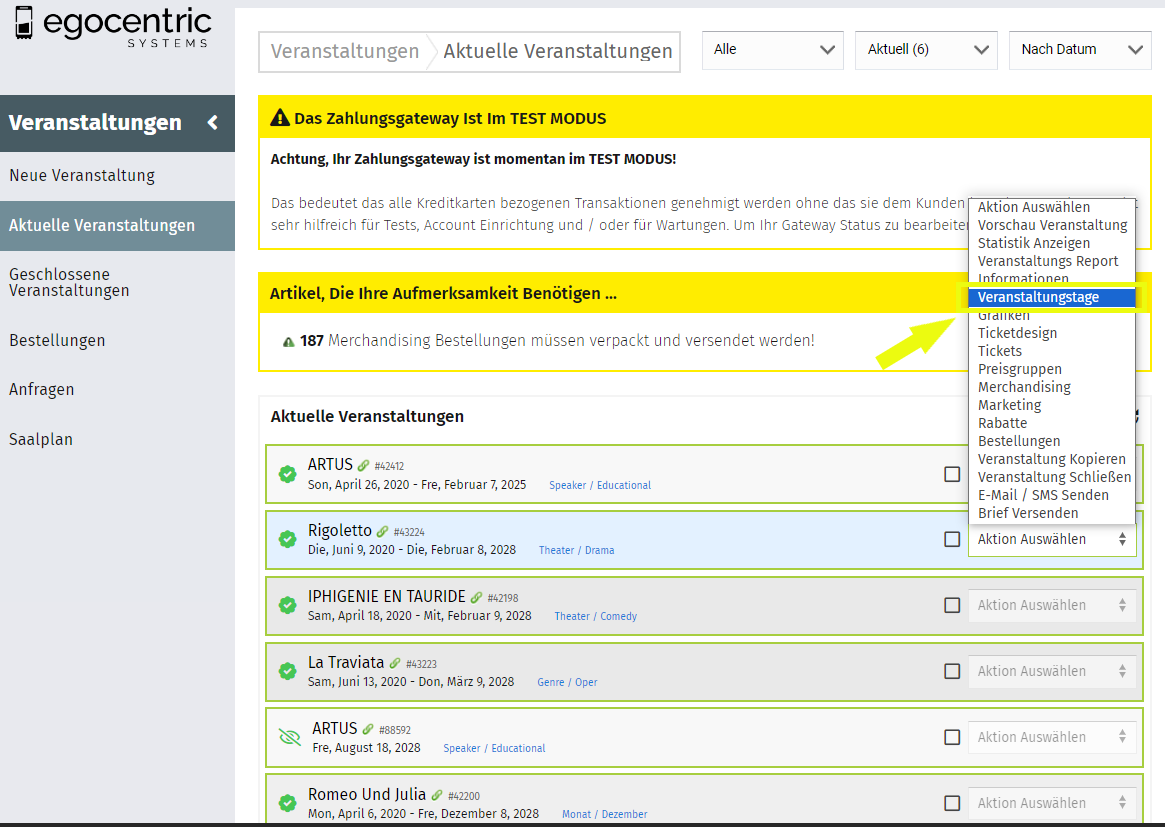 - Gehe zu "Aktuelle Veranstaltungen" und wähle deine Veranstaltung unter "Aktion" > "Veranstaltungstage" aus.