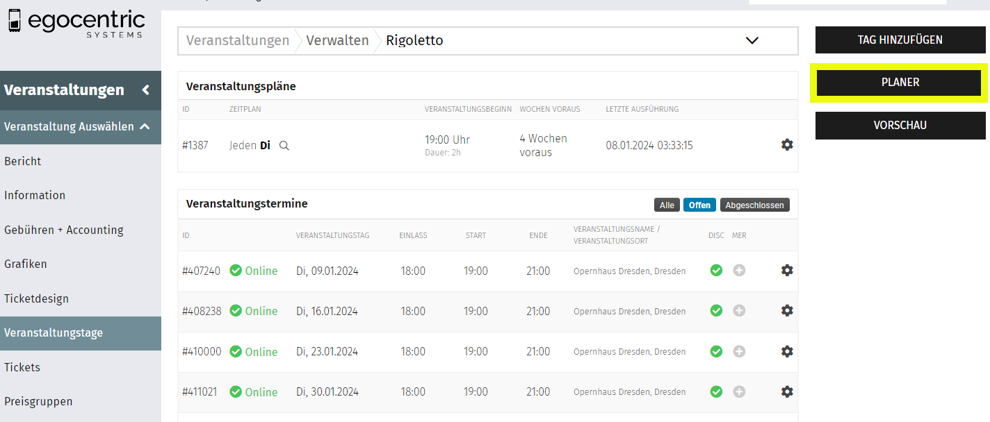Wenn du dir den nächsten Veranstaltungstag aus dem Planer sofort anzeigen lassen willst, dann klicke bei dem Zahnrad auf Planer ausführen, ansonsten wird der Planer erst in der nächsten Nacht ausgeführt und du kannst am nächsten Tag alle zukünftig geplanten Veranstaltungen sehen.