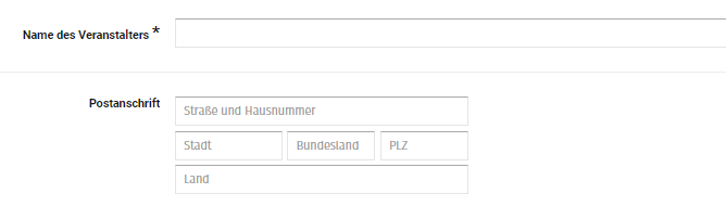 In dem Feld Name des Veranstalters kannst Du den Namen des Veranstalters angeben. In dem Feld Postanschrift hinterlegst Du bitte Deine Anschrift.