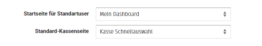 Hier kannst Du die Startseiten für die Standarduser festlegen. Zum einen die Startseite nach dem Einloggen "Startseite für Standarduser" und die Standardseite im Kassenbereich "Standard-Kassenseite", wenn der User zu dem Menüpunkt Kasse wechselt.