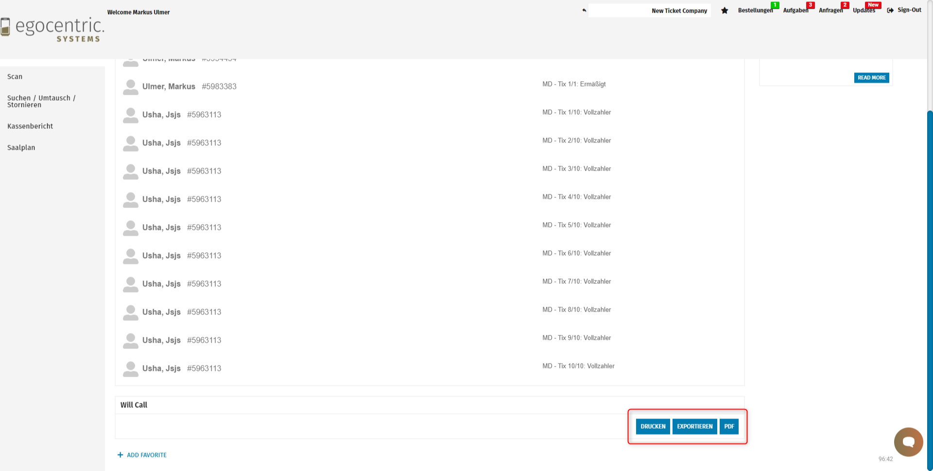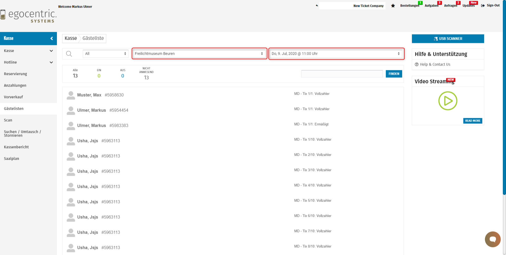 Die Gästeliste findest du unter KASSE > GÄSTELISTEN hier kannst du nun dein Event und deinen Veranstaltungstag auswählen.