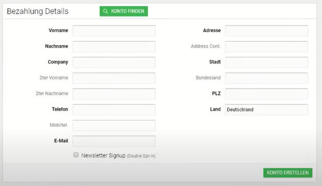 Öffne die Verkaufsmaske. Nachdem Du Produkte in den Warenkorb gelegt hast, hast Du die Möglichkeit, ein neues Konto zu erstellen. Gib die geforderten Informationen ein (Pflichtfelder sind fett markiert) und klicke auf "Konto erstellen".