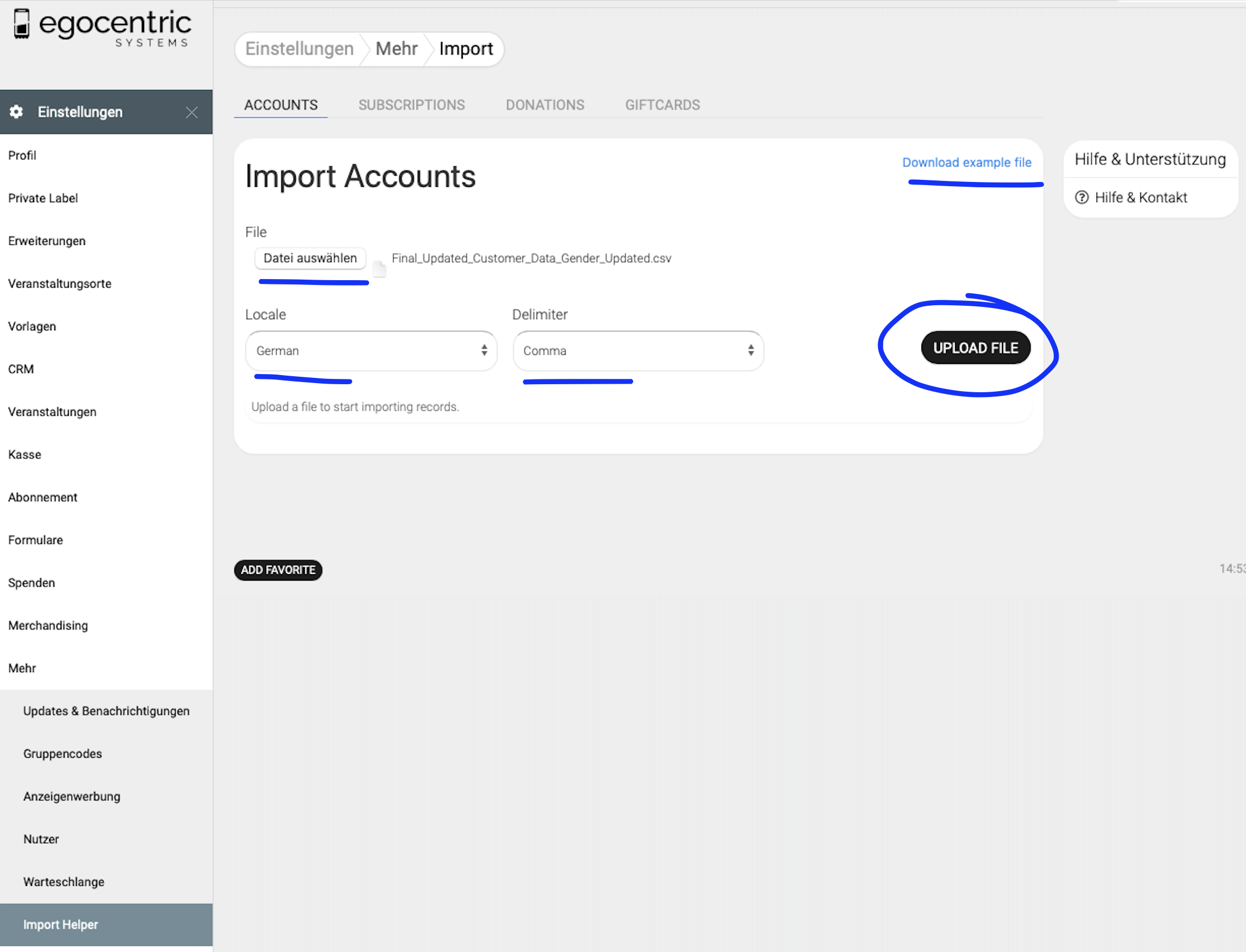 Gehe im Bereich Einstellungen auf "Mehr" und anschließend auf "Import-Helper". Unter dem ersten Bereich "Accounts" kannst du Kundendaten importieren. Hier findest Du auch eine Beispieldatei, die Du runter laden kannst. (Diese steht übrigens auch hier am Ende des Artikels zum Download bereit). Erstelle nun Deine Importdatei und lade sie hier hoch. Beachte: als Locale muss German und als Delimiter muss Comma ausgewählt sein. Wenn du alles korrekt eingestellt hast, gehe auf Upload.