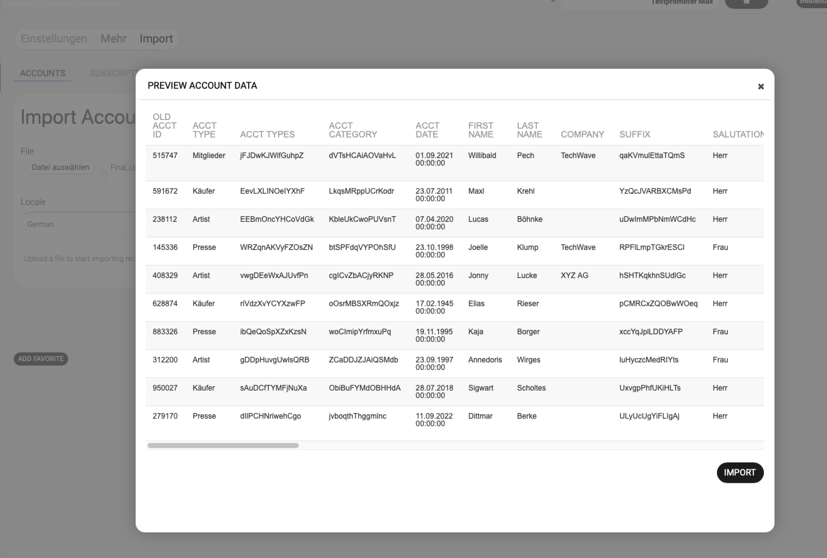 Im nächsten Schritt werden Dir die ersten Kundendatensätze angezeigt. Überprüfe, ob alle Daten korrekt sind. Wenn alles stimmt, klicke auf den Button Import, um den Import abzuschließen.