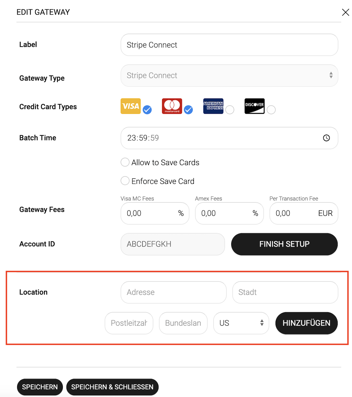 - In den Zahlungseinstellungen bei Stripe Connect im Ticketsystem wird der Standort hinterlegt.