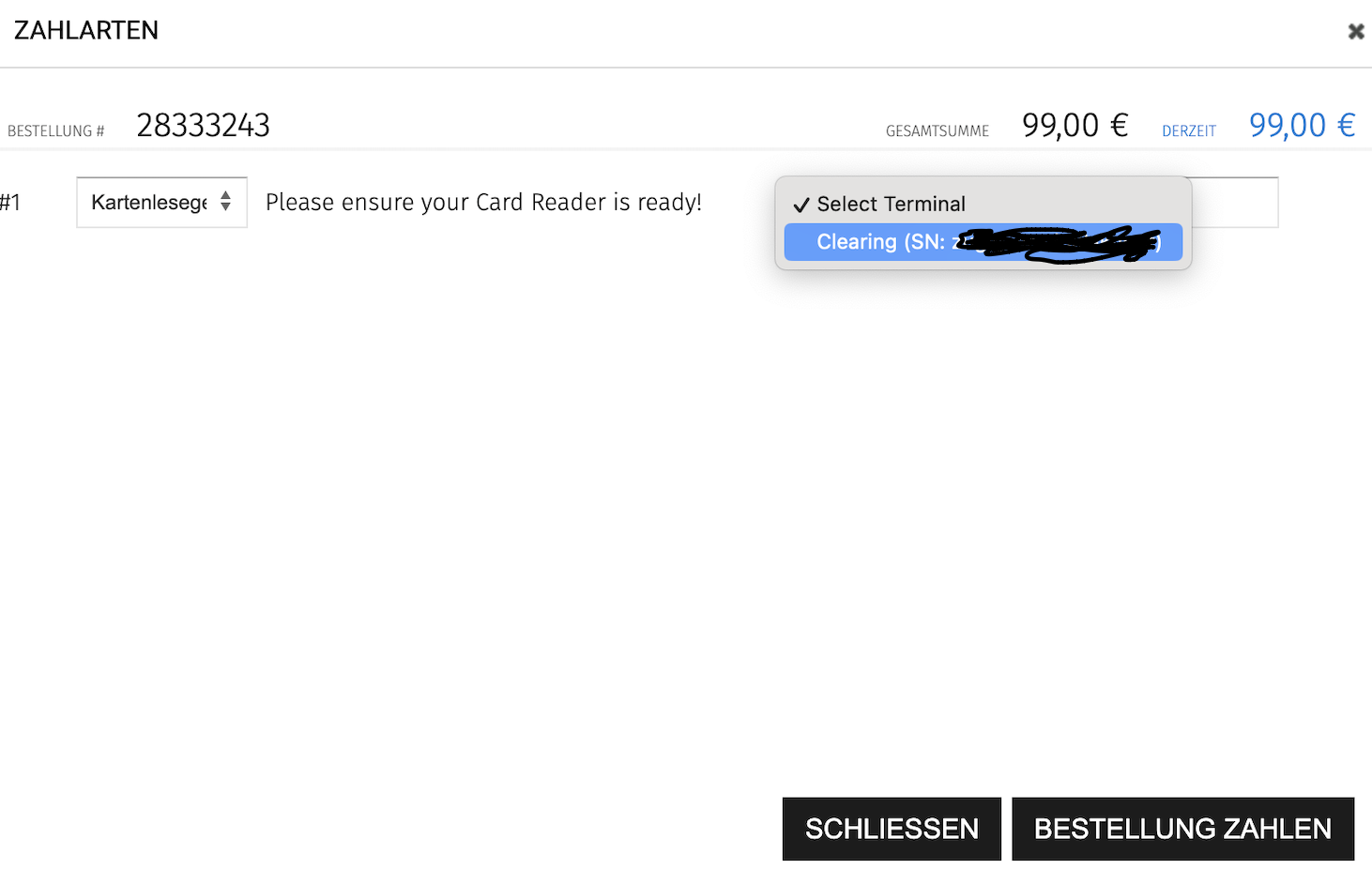 Das Gerät ist nun unter der Zahlart "Kartenlesegerät" verfügbar.
