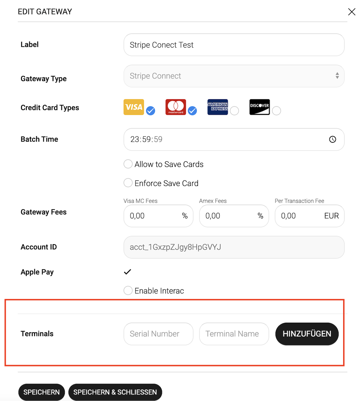 - Die Seriennummer des Geräts wird anschließend in den Zahlungseinstellungen hinterlegt.
