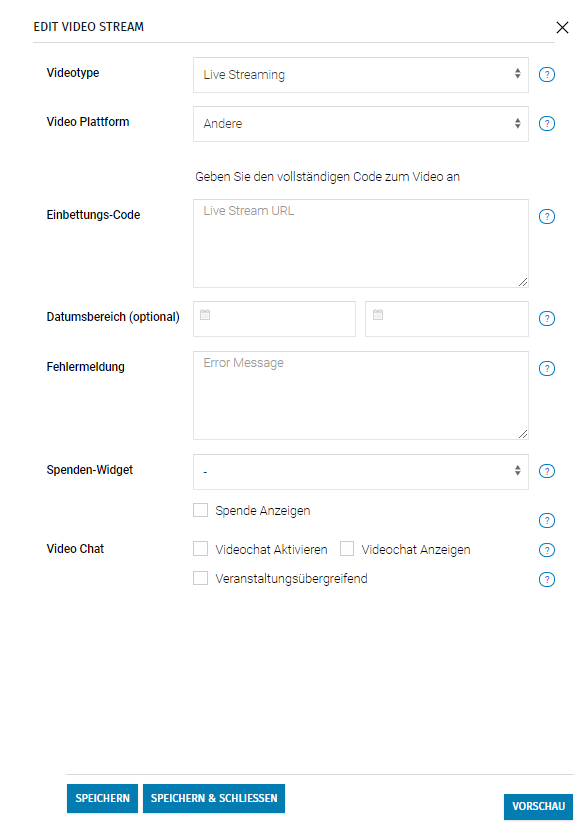 - Video Plattform: Hier kannst Du entweder einen vorkonfigurierten Anbieter auswählen oder über die Auswahl "Andere" einen kompletten Einbettungscode hinterlegen.