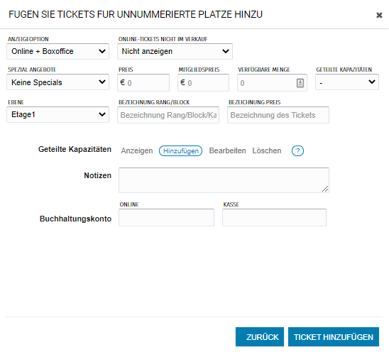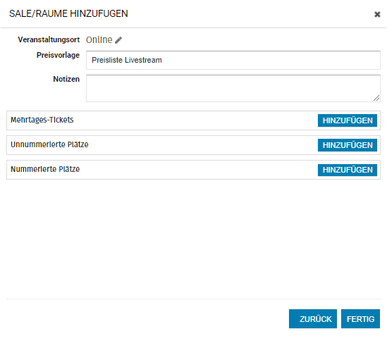 Als nächstes kannst Du eine Preisliste, zugehörig zu diesem Veranstaltungsort, erstellen. Vergebe einen Namen für Deine Preisliste. Diesen trägst Du in das Feld "Preisvorlage" ein. Danach fügst Du die gewünschten Preise hinzu. Gehe dafür zu "Hinzufügen" >> "Unnummerierten Plätzen" und gebe Deine Werte ein.