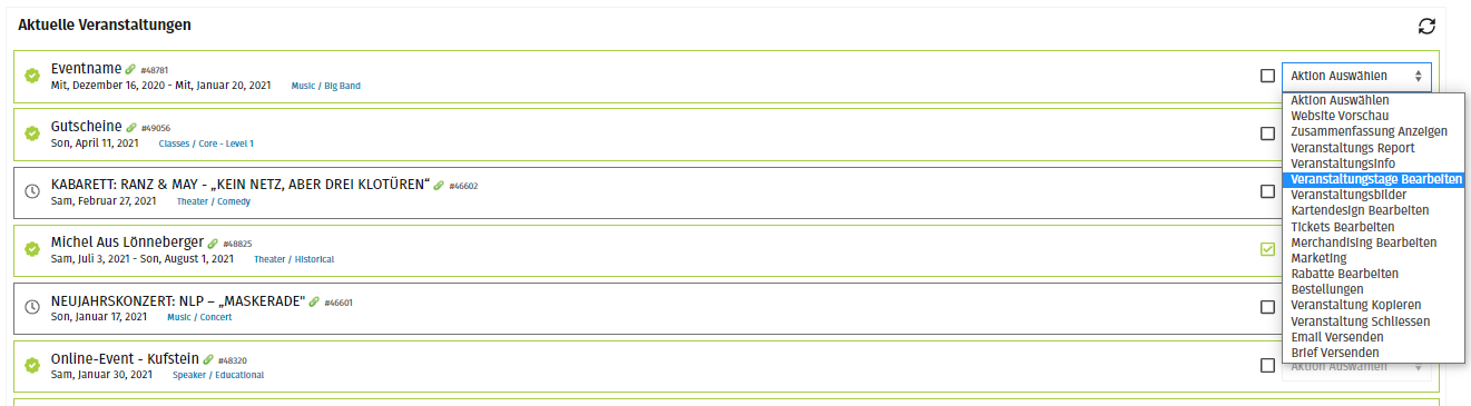 Navigiere zu "Veranstaltungen" und wähle bei der entsprechenden Veranstaltung die Aktion "Auswählen" >> "Veranstaltungstage bearbeiten" aus.