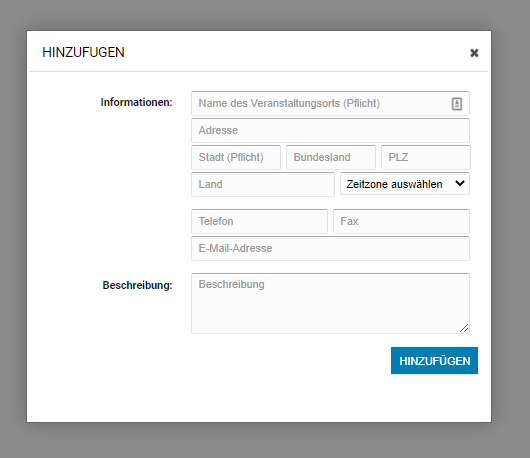 Sollte kein passender Veranstaltungsort hinterlegt sein, kannst Du über "Hinzufügen" einen neuen Veranstaltungsort anlegen. Es öffnet sich ein Fenster, in dem Du die Daten für Deinen neuen Veranstaltungsort eintragen kannst.