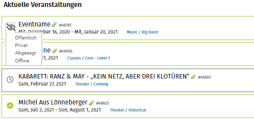 Im letzten Schritt geht es um die Veröffentlichung Deines Livestreams. Navigiere zu "Veranstaltungen" und suche die entsprechende Veranstaltung. Links neben dem Veranstaltungsnamen werden die einzelnen Symbole für den Status der Veranstaltung angezeigt. Klicke auf das Symbol und wähle "Öffentlich" aus. Deine Veranstaltung ist freigeschalten.