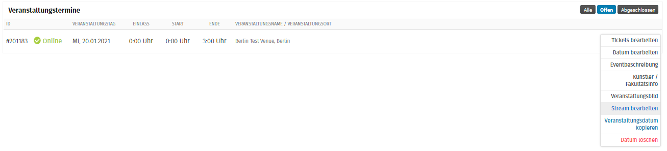 Daraufhin gelangst Du zum Menüpunkt "Veranstaltungstage". Wähle hier über das Zahnrad "Stream Bearbeiten" aus.