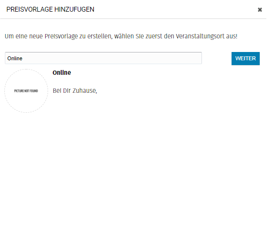 Unter "Einstellungen" >> "Vorlagen" >> "Preistemplates" kannst Du eine neue Preisliste anlegen. Klicke dazu auf "Preisvorlage hinzufügen". Suche nun in dem Fenster nach dem soeben angelegten Veranstaltungsort, wähle diesen aus und klicke dann auf "Weiter".
