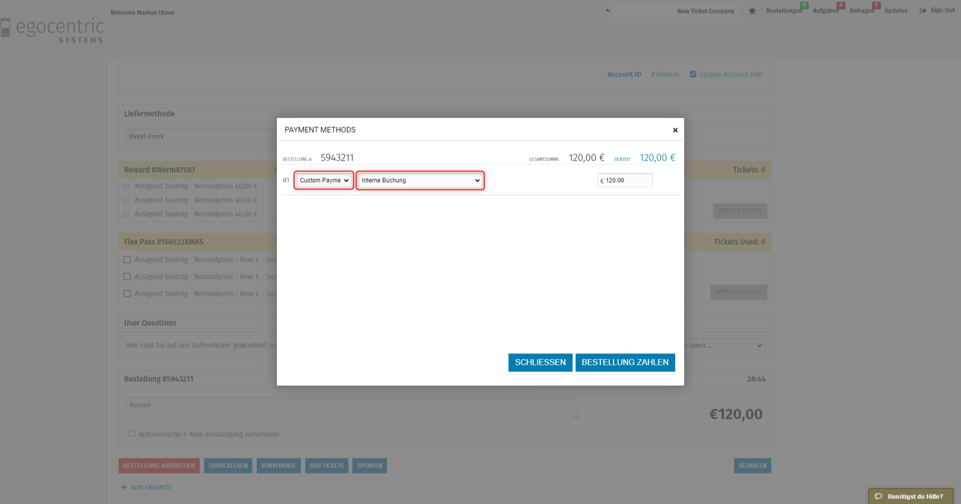 Wähle dazu im Bezahlfenster die Zahlart Custom Payment aus. Anschließend kannst du nun aus deinen eingerichteten Zahlarten auswählen.