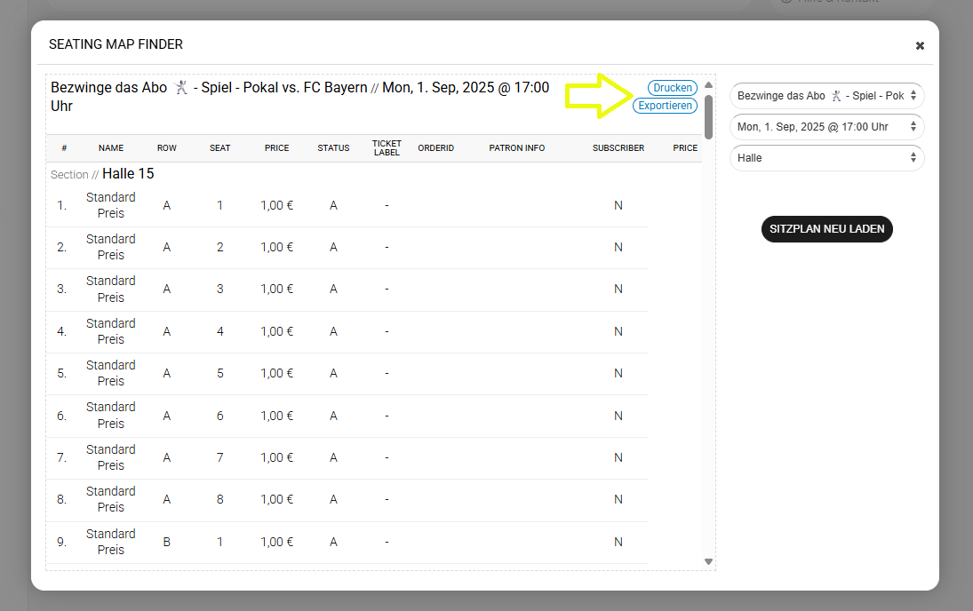 - Auslastungsplan exportieren: Erstelle eine Listenzusammenfassung über den Status aller Sitzplätze und Kundendaten, sofern der Platz bereits gebucht wurde.