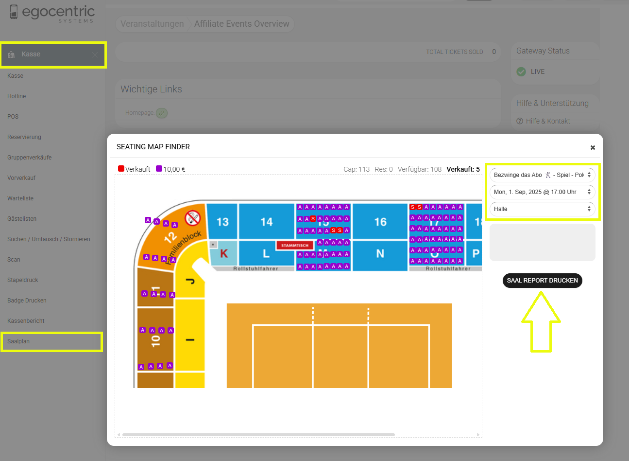 5. Klicke auf den Button „Saal Report drucken".