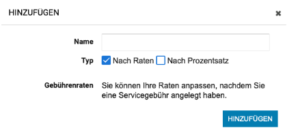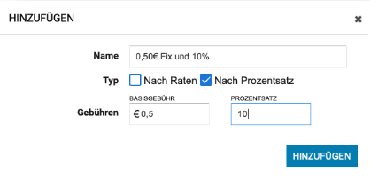 Hier kannst du über das Zahnrad das jeweilige Gebühren-Template bearbeiten oder über den Button Hinzufügen ein neues Template anlegen. Nachdem du auf den Button Hinzufügen geklickt hast, öffnet sich eine Eingabemaske für die Eingabe der Bezeichnung des Templates (Name) und der Auswahl (Typ), ob du Gebühren prozentual oder mit einem festen Betrag einrichten möchtest.