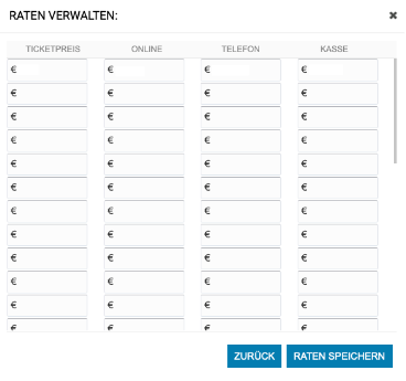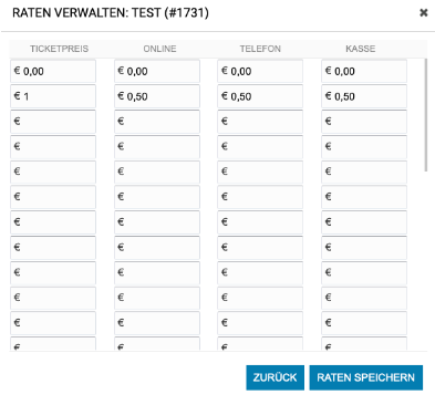 In der Linken Spalte Ticketpreis kannst du nun einen Wert eingeben, ab dem dann die Gebühren, die in den jeweiligen Spalten Online, Telefon und Kasse stehen.