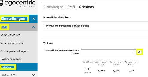 - Gebühren einrichten: Gehe zu Einstellungen >> Profil >> Gebühren, um Gebühren-Templates für Tickets zu erstellen oder zu bearbeiten. Du kannst Gebühren prozentual oder als feste Beträge einrichten.