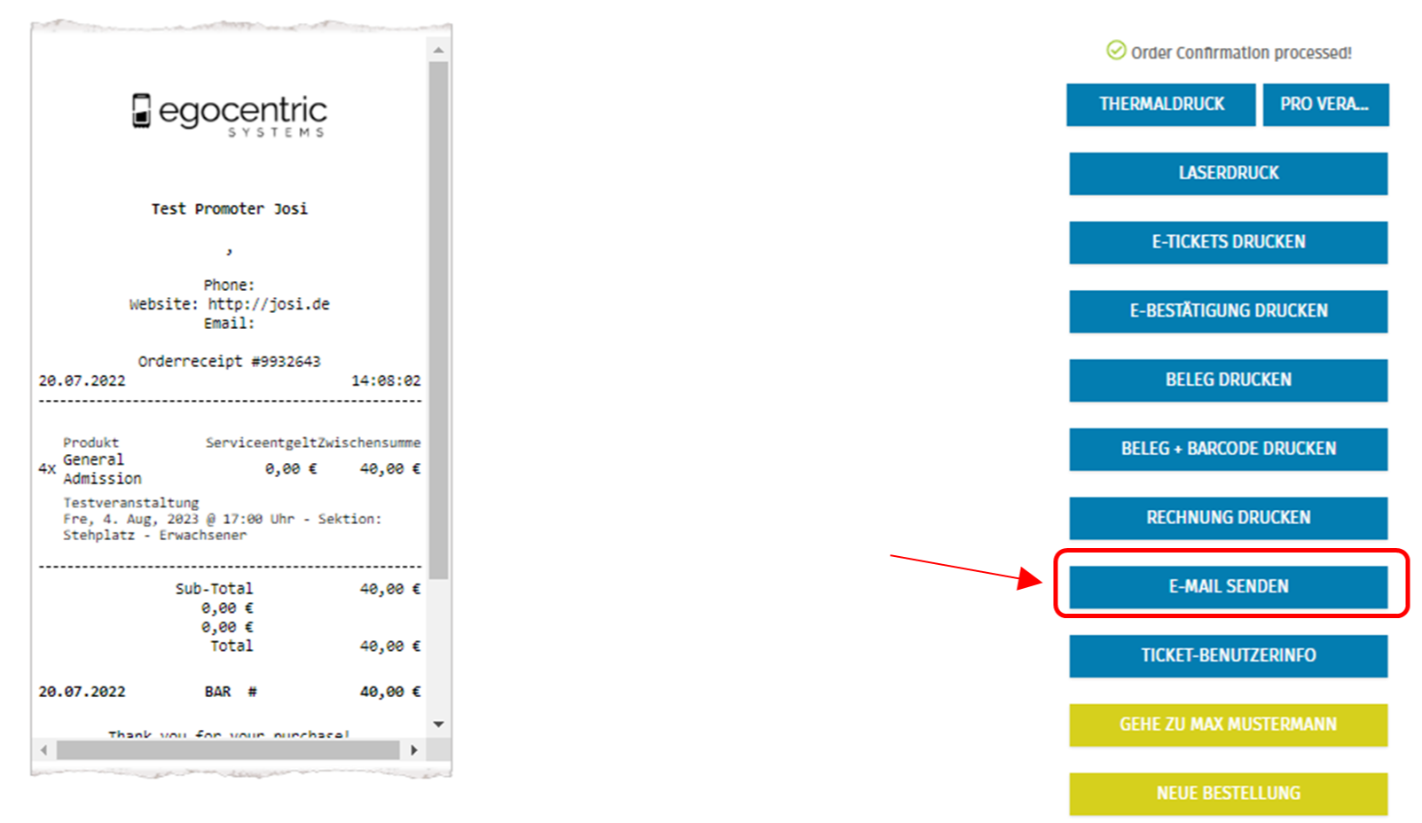 6. Jetzt siehst du die Quittungsmaske und kannst über die Buttons rechts auf der Seite auswählen, wie das Ticket gedruckt werden soll. Zur Auswahl stehen Thermaldruck, Laserdruck oder auch E-Tickets drucken.
