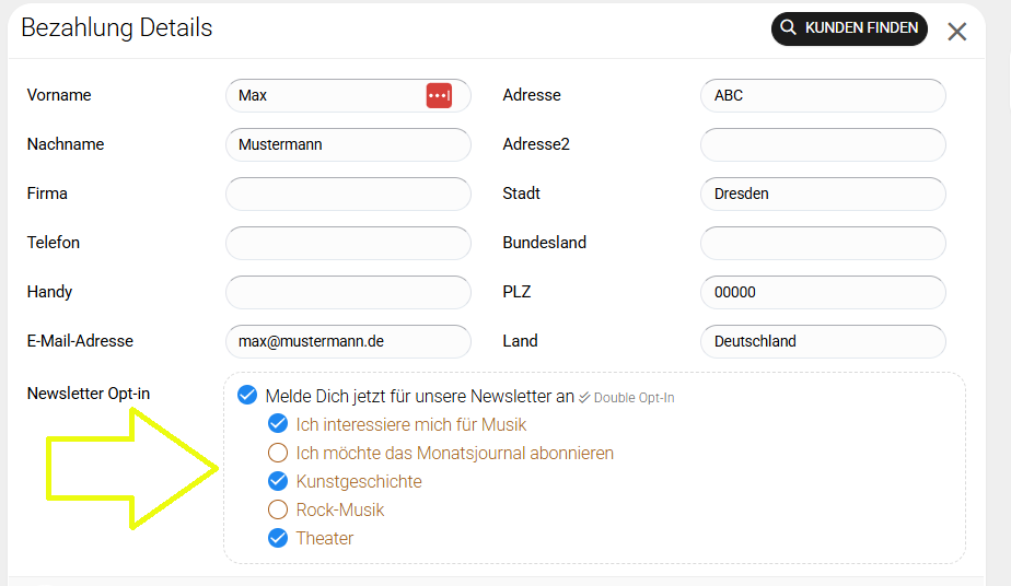 5. Setze den Haken bei Newsletter Opt-In und wähle die gewünschten Newsletter aus.