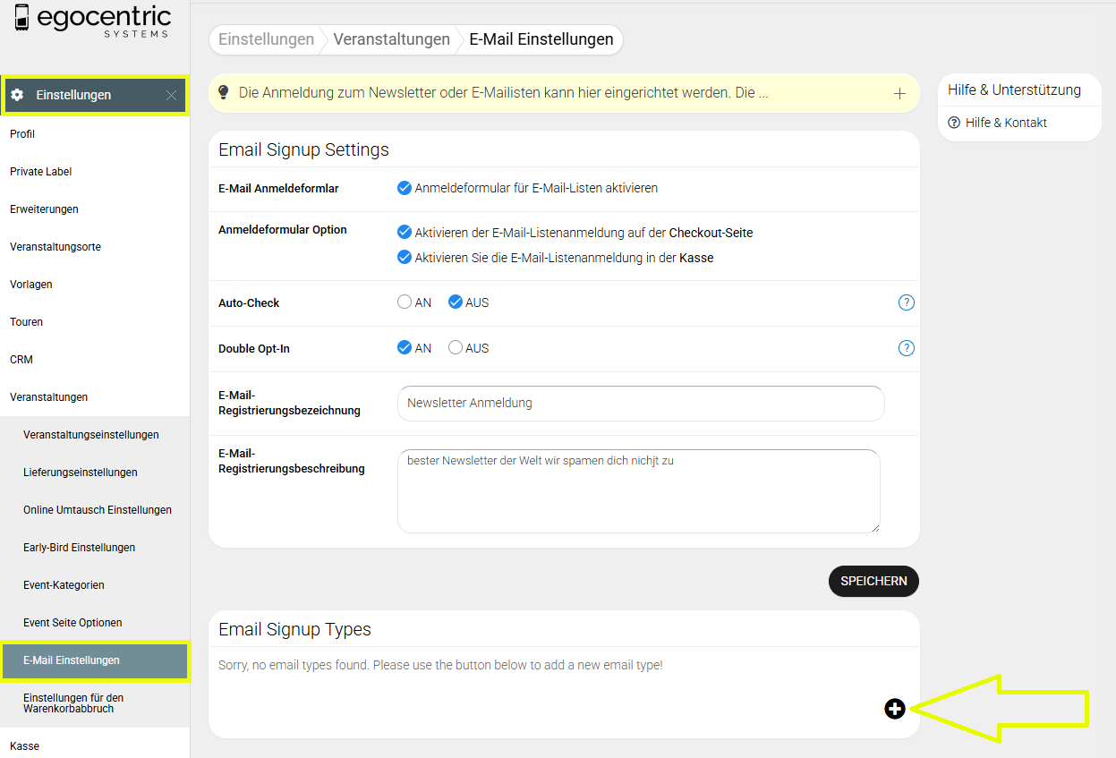2. Klicke auf „Einstellungen“ → „Veranstaltungen“ → „E-Mail Einstellungen“.