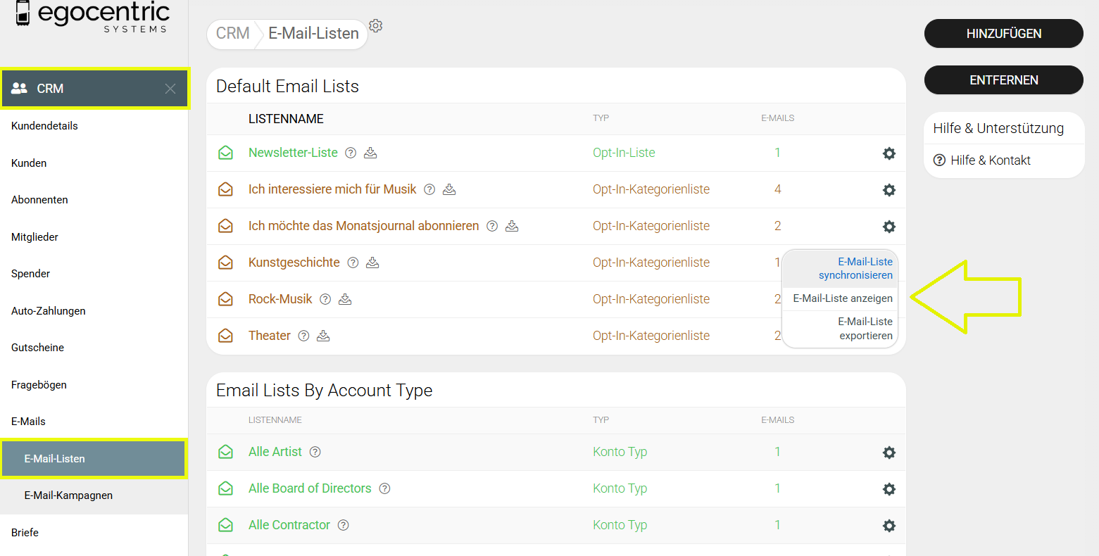2. Klicke auf „CRM“ → „E-Mails“ → "E-Mail-Listen".
