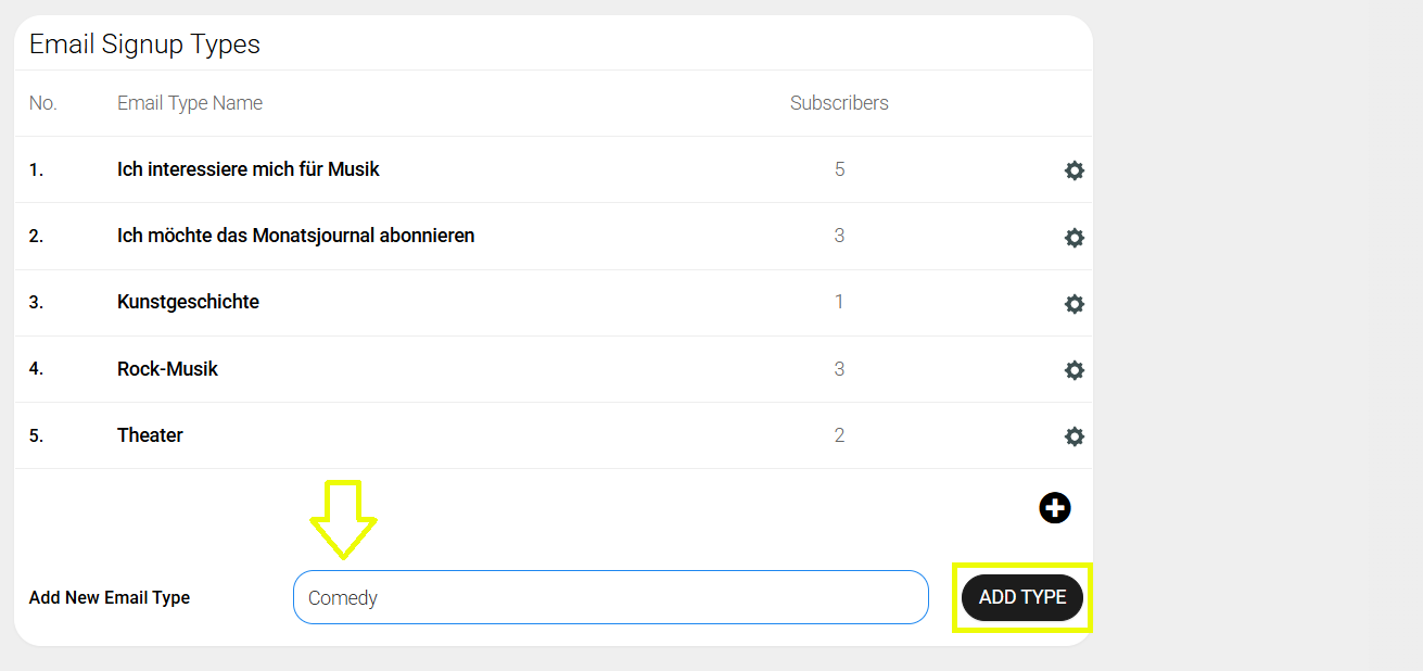3. Klicke auf das Zahnrad-Symbol hinter den Kategorien, um die Abonnenten anzuzeigen, die Liste mit MailChimp etc. zu synchronisieren oder zu exportieren.