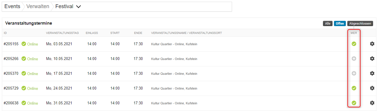 In der Übersicht deiner Veranstaltungstage siehst du nun einen grünen Hacken bei den Tagen in der Spalte Merchandising. Dies bedeutet, dass diesem Tag Produkte zugeordnet sind. Wenn dort nur ein plus dargestellt ist, sind diesem Tag keine Produkte zugeordnet.