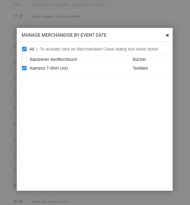 Wähle nun die gewünschten Events/Veranstaltungen aus, bei denen du dieses Produkt verkaufen möchtest.
