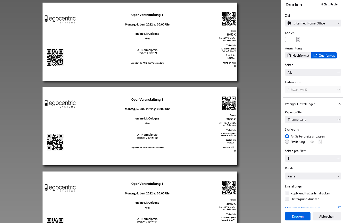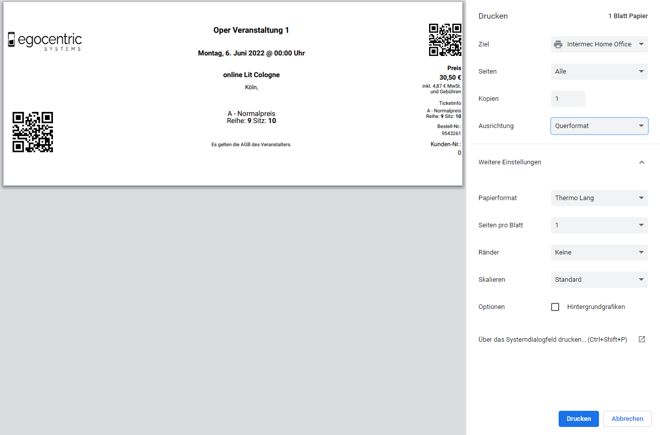 Wähle in den Druckeinstellungen beim Drucken die Werte aus, wie im nachfolgenden Bild dargestellt. Bei Papierformat wähle das erstellte Layout aus, welches du im Drucker angelegt hast.