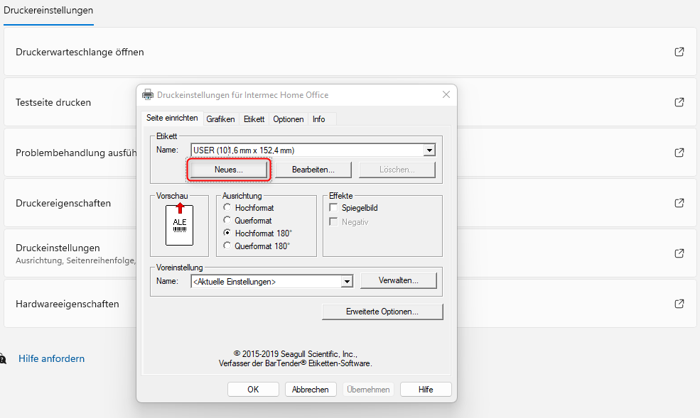 Um das richtige Layout einzustellen, gehe auf deinem Rechner zu Drucker und Scanner. Wähle jetzt den installierten Drucker aus und klicke dann auf Druckeinstellungen. Unter Etikett klicke nun auf neues.