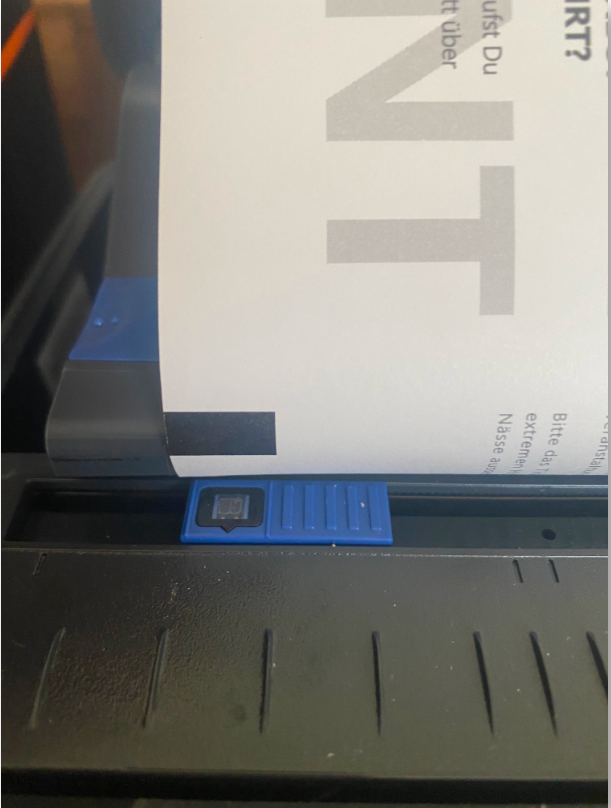 - Schiebe den Sensor an der vorderen Seite in die Position, dass die Schwarzmarke auf der Rückseite des Rohlings direkt darüber läuft.