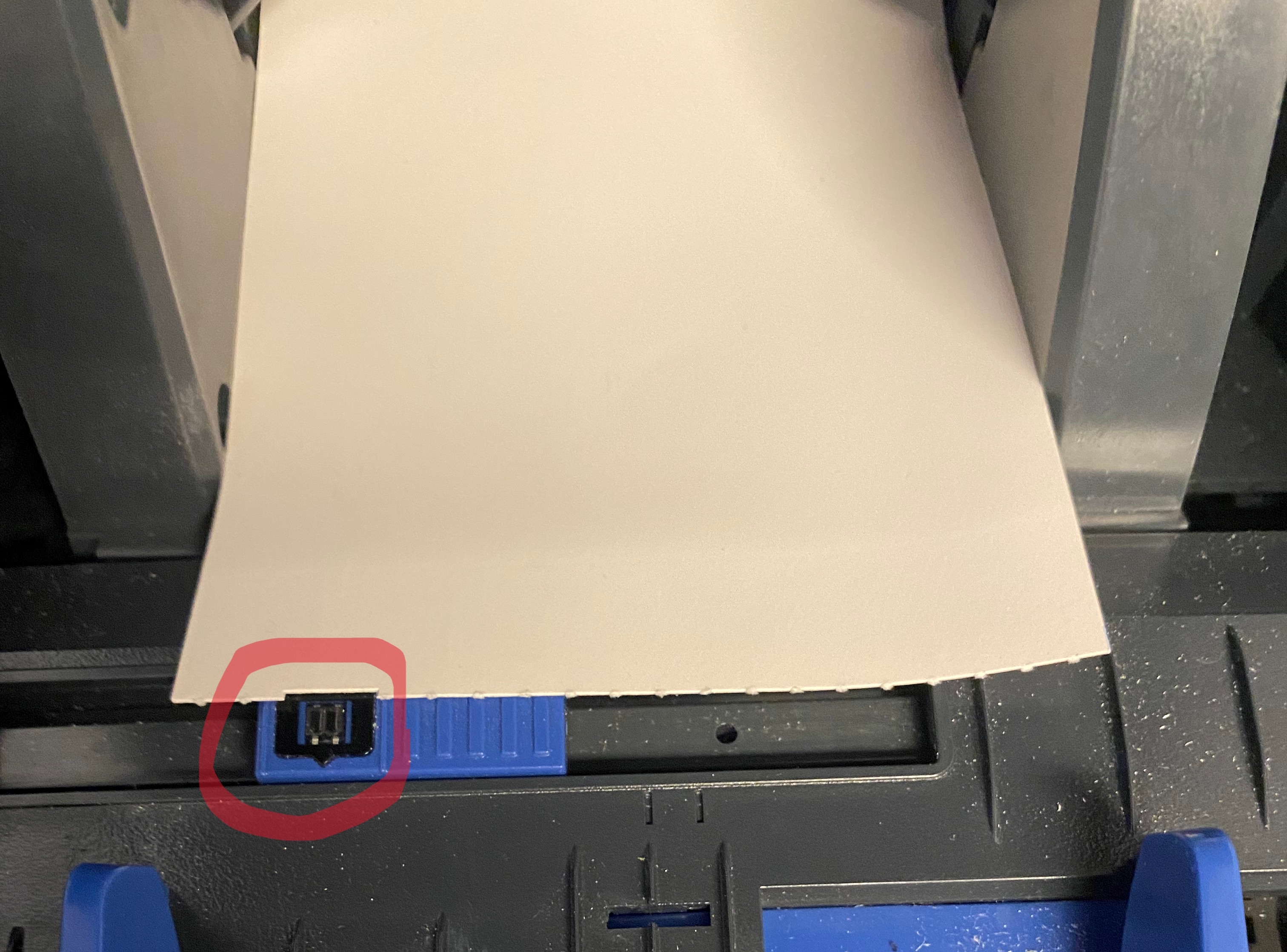 Da die Schwarzmarke nicht bei jedem Rohling an derselben Stelle platziert ist und auch nicht direkt zwischen den einzelnen Rohlingen ist, bleibt der Rohling nach der Kalibrierung nicht korrekt an der Abrisskante stehen. Daher empfehlen wir hier Rohlinge mit einem Gap zu nutzen.