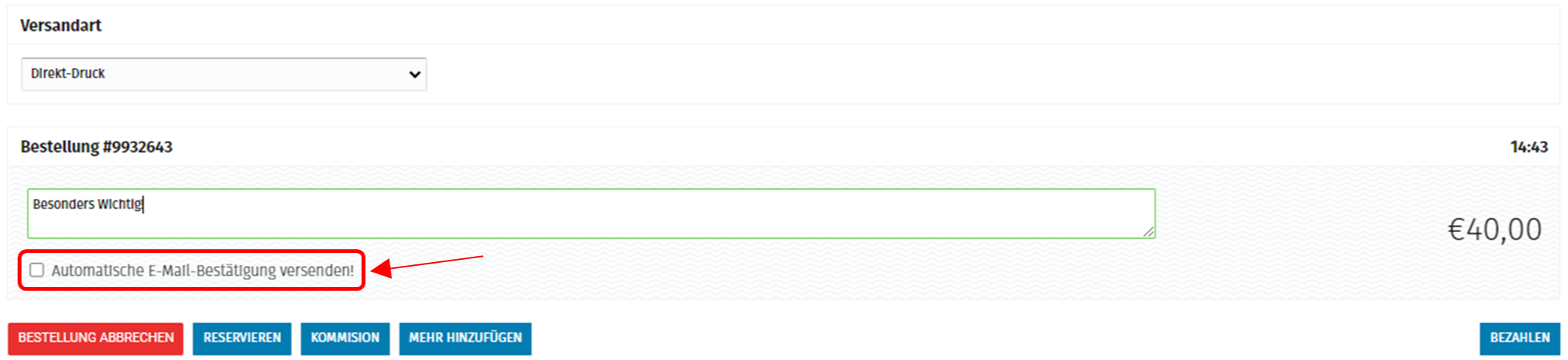Es können außerdem Notizen zur Bestellung hinzugefügt und eine automatische