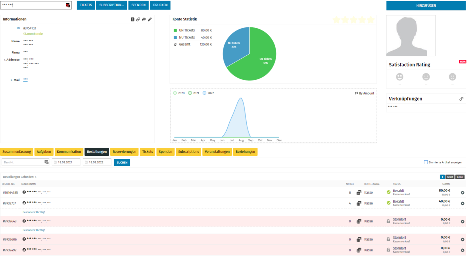 3. Nun erscheint die Verkaufshistorie, in der du alle Kundendetails, Käufe, Stornierungen und Umbuchungen des Kunden sehen kannst.