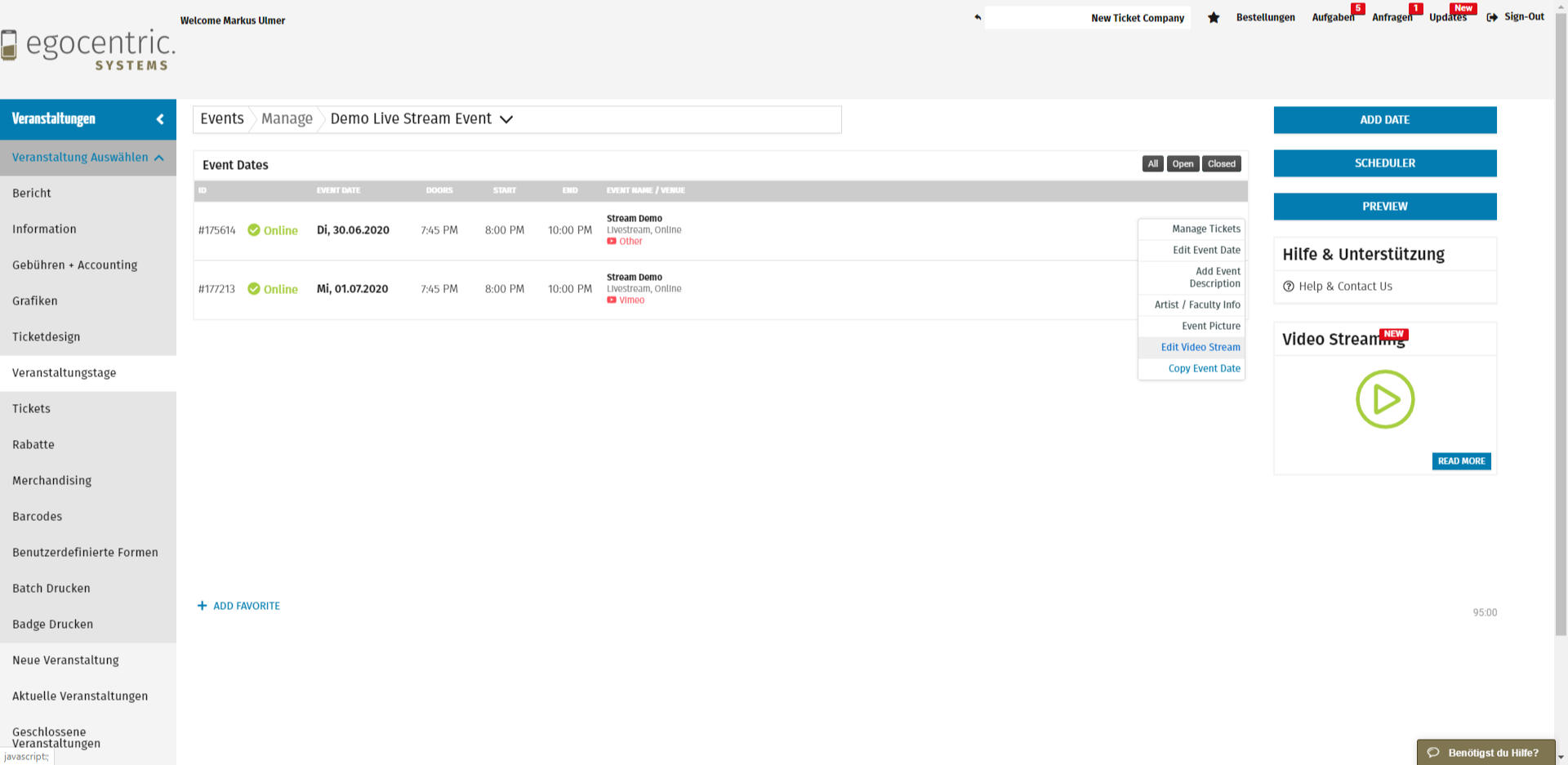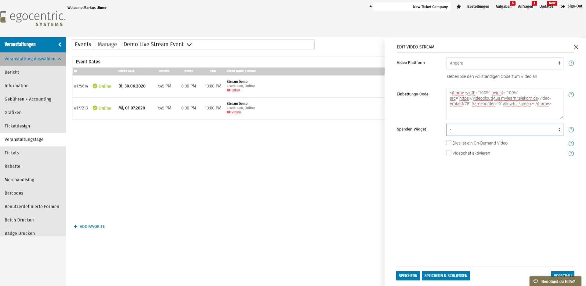 Einrichtung der Tickets für den Livestream