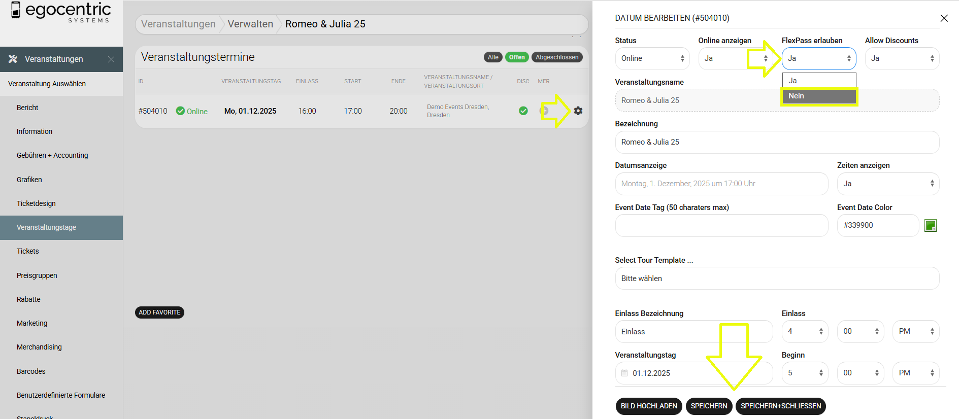 - Schließe einzelne Veranstaltungstage vom Flex-Pass aus.